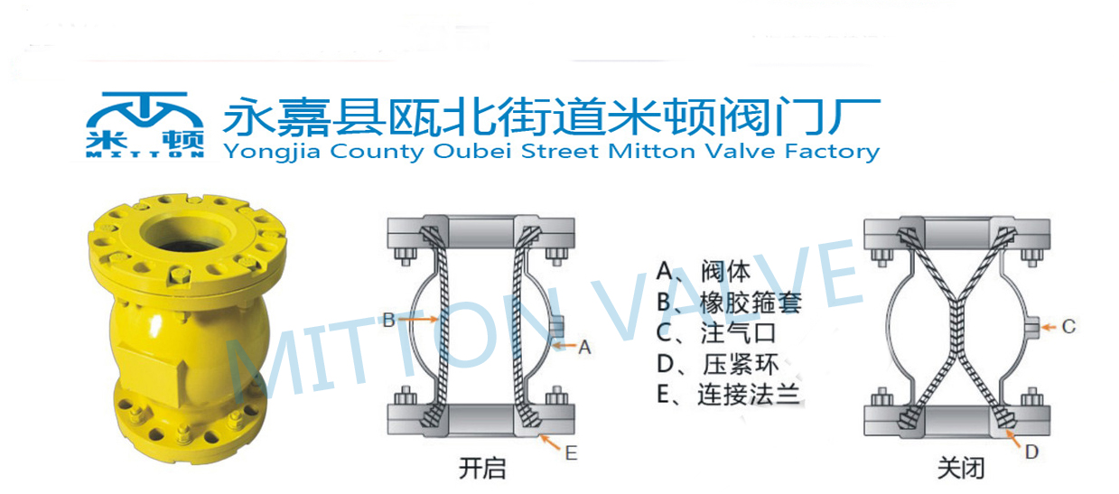 工作原理:在控制介質未輸入時,膠套和閥體之間的空腔與大氣連通,撓性閥膠套受流體壓力處于向外張緊狀態。由于管套內有一定角度排列的增強簾布層,使管套軸向和徑向壓力相互平衡,所以管套的長度與直徑不會因流體壓力而變化。當控制介質進入管套與閥體之間的空腔時,管套在介質壓力下變形截流。