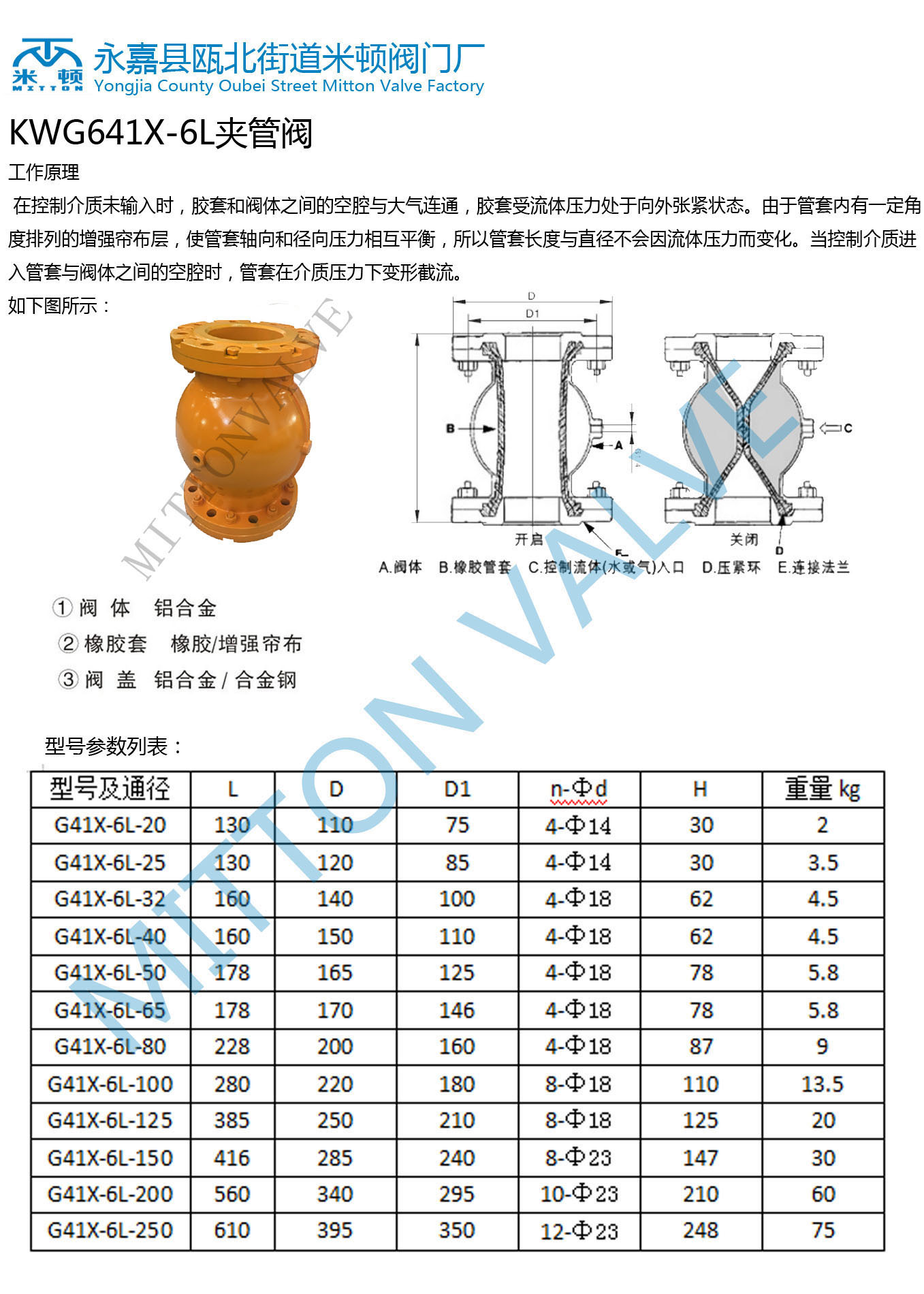 工作原理:在控制介質未輸入時,膠套和閥體之間的空腔與大氣連通,撓性閥膠套受流體壓力處于向外張緊狀態。由于管套內有一定角度排列的增強簾布層,使管套軸向和徑向壓力相互平衡,所以管套的長度與直徑不會因流體壓力而變化。當控制介質進入管套與閥體之間的空腔時,管套在介質壓力下變形截流。